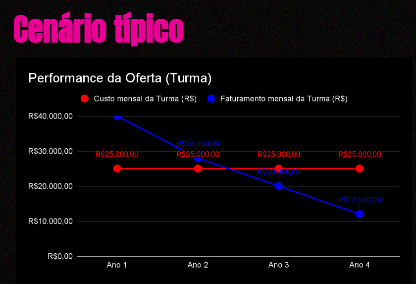 Em um cenário típico, o Faturamento Mensal da Turma (R$) cai de R$ 40.000,00 no Ano 1 para R$ 12.000,00 no Ano 4 , enquanto o Custo mensal da Turma (R$) se mantém em R$ 25.000,00.